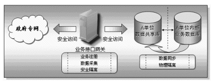 業(yè)務(wù)接入網(wǎng)關(guān)放置在每一個接入到本系統(tǒng)的部門或單位內(nèi),具有快速方便的異構(gòu)數(shù)據(jù)庫的連接能力,它主要完成兩個方面的功能,一方面實現(xiàn)本部門共享信息的對外發(fā)布,另一方面也通過核心的信息交換機實現(xiàn)其它相關(guān)部門的共享信息的采集工作。業(yè)務(wù)接口網(wǎng)關(guān)具有兩個網(wǎng)絡(luò)接口,一端連接本單位的內(nèi)部網(wǎng)絡(luò),另一端接入政府專網(wǎng)中。