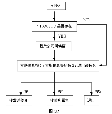 其中PTFAX.VOC存在當(dāng)前工作路徑,如果存在,則播放公司問候語,接著播放下一句語音提示;如果該文件不存在,則系統(tǒng)直接播放VFGT.VOC的內(nèi)容,用戶可根據(jù)實(shí)際需求而定。