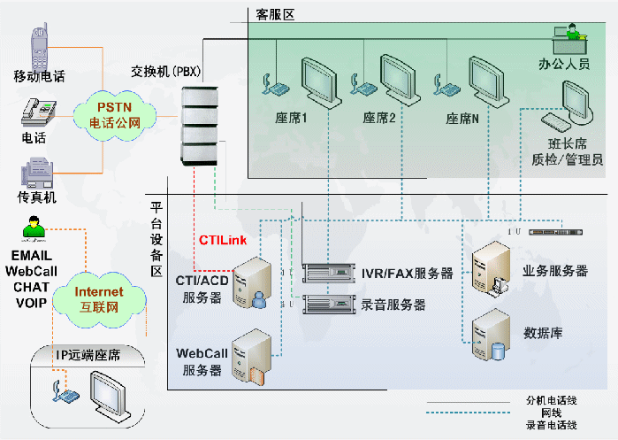 包含了PBX、CTI服務(wù)器、IVR/FAX服務(wù)器、錄音監(jiān)控 系統(tǒng)、報表統(tǒng)計系統(tǒng),CRM客戶管理等。