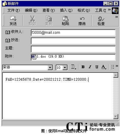 - 電子郵件提交:用戶使用電子郵件應(yīng)用程序(如Notes或 Outlook)直接提交傳真,傳真文件為 tif、word、excel、txt、html、jpg等格式的文件;