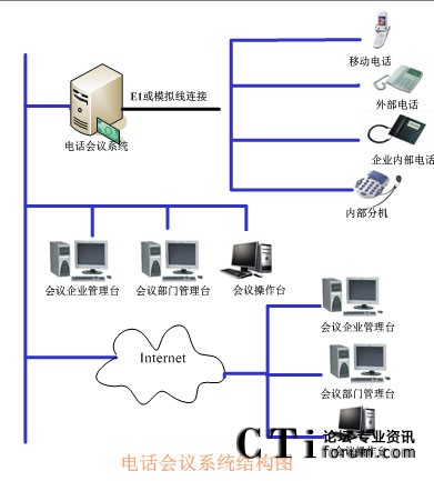 TalenTel CNF電話會議系統(tǒng)可以與程控交換機配合使用,也可以直接與局方的系統(tǒng)進行連接,系統(tǒng)的構(gòu)成含如下幾部分:TalenTel CNF電話會議系統(tǒng)服務(wù)器(ctsIVR)、會議企業(yè)管理員模塊、會議部門管理員模塊、會議操作員管理模塊、數(shù)據(jù)庫等組成。