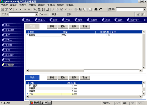 客戶單位的分類較聯(lián)系人的分類更復(fù)雜。常用的分類有:按照企業(yè)規(guī)模來分類(大、中、小,層次自定義,下同)、按照該客戶與本單位的緊密程度分類(緊密、普通、疏遠(yuǎn))、按照該客戶的重要性分類(重要、普通、次要)、按照該客戶的忠誠(chéng)度分類(忠誠(chéng)、普通、游移)。有一些用戶企業(yè),希望對(duì)客戶單位特征進(jìn)行采集,進(jìn)而進(jìn)行客戶信用評(píng)價(jià)。信用特征的類別可以多達(dá)數(shù)十種類(詳細(xì)情況可參考有關(guān)書籍)。利用SynleadCRM,您可以為每個(gè)類指定系數(shù),為類下屬的每個(gè)評(píng)價(jià)指定評(píng)分分值。例如,您可以建立一個(gè)類別為"客戶倉(cāng)庫(kù)積壓商品的情況",系數(shù)為1,該類別下屬的評(píng)價(jià)有"很多1分"、"一般3分"、"少1分"、"未知0分",如果指定某客戶該類別的評(píng)價(jià)為一般,則該項(xiàng)目得分為3分*1(系數(shù))=3分。依此類推,您還可以指定更多的分類與評(píng)價(jià),例如:客戶經(jīng)營(yíng)場(chǎng)所所處的位置、客戶在企業(yè)生命周期中所處的位置、客戶在行業(yè)中的地位、客戶產(chǎn)品的組合情況、客戶產(chǎn)品覆蓋的市場(chǎng)范圍、客戶產(chǎn)品的淡旺季規(guī)律、客戶近年?duì)I業(yè)額的增減趨勢(shì)、客戶的年度營(yíng)業(yè)額、客戶的現(xiàn)金周轉(zhuǎn)能力、客戶的負(fù)債情況、客戶是否涉及中大訴訟等。每一個(gè)類別項(xiàng)目的評(píng)分經(jīng)過系數(shù)的加權(quán)運(yùn)算后,可以求和,得到這個(gè)客戶的總評(píng)分。未來也可以利用分析模型對(duì)此類數(shù)據(jù)進(jìn)行進(jìn)一步的分析,提供輔助決策所需要的圖表和報(bào)表。