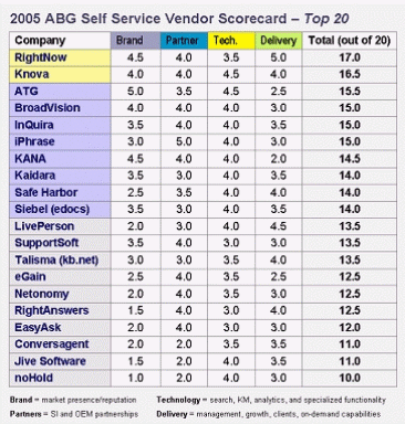 著名企業(yè)咨詢(xún)公司ABG(Allen Bonde Group )近日對(duì)著名自助服務(wù)軟件制造商進(jìn)行了綜合評(píng)估。此次評(píng)估綜合考慮廠商在四個(gè)類(lèi)別中的表現(xiàn):品牌、合作伙伴、技術(shù)水平、實(shí)施。綜合評(píng)估滿分為20分。