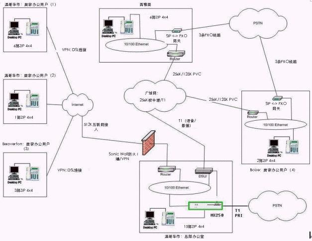 系統(tǒng)的安裝是由蘇迪思科技公司的認(rèn)證增值分銷(xiāo)商Xiologix 來(lái)實(shí)現(xiàn)的。在45分鐘內(nèi)Xiologix 的工程師就設(shè)定和調(diào)試完畢MX250并且完成了第一期20部蘇迪思ZIP4x4 IP電話的安裝。一個(gè)月后Consani Associates公司又進(jìn)行了系統(tǒng)擴(kuò)展追加了30個(gè)用戶許可和另外30部ZIP4x4 IP電話。Consani Associates 公司采用蘇迪思科技的MX250系統(tǒng)后的公司系統(tǒng)網(wǎng)絡(luò)拓樸圖如下: