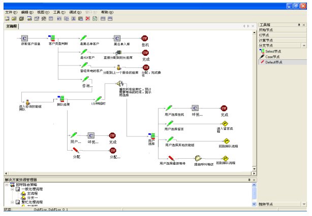 Hi-Link提供圖形化、流程式的ACD路由策略定制工具,實(shí)現(xiàn)ACD流程的靈活定義和配置。該工具不僅僅實(shí)現(xiàn)了流程邏輯、資源管理和數(shù)據(jù)庫(kù)訪問的可配置,而且可以在流程中內(nèi)嵌VBScript處理邏輯,進(jìn)而實(shí)現(xiàn)更加強(qiáng)大的路由管理能力。如圖所示: