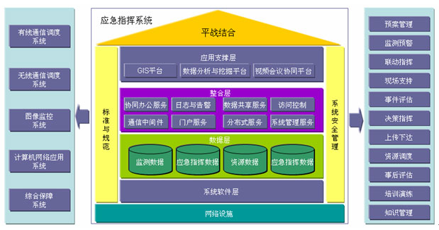 應(yīng)急基礎(chǔ)平臺是基于先進(jìn)信息技術(shù)、網(wǎng)絡(luò)技術(shù)、GIS技術(shù)、通信技術(shù)和應(yīng)急信息資源基礎(chǔ)上的,充分利用現(xiàn)有資源,依托政府系統(tǒng)電子政務(wù)建設(shè),建立統(tǒng)一應(yīng)急指揮網(wǎng)絡(luò)平臺,實現(xiàn)緊急事件報警的統(tǒng)一接入與交換。