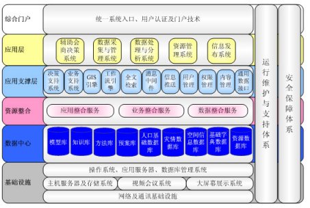 整個系統(tǒng)的底層是信息系統(tǒng)的基礎(chǔ)設(shè)施,這包括網(wǎng)絡(luò)及通訊設(shè)施、主機(jī)服務(wù)器及存儲系統(tǒng)、視頻會議系統(tǒng)、大屏幕數(shù)據(jù)演示系統(tǒng),以及操作系統(tǒng)、數(shù)據(jù)庫管理系統(tǒng)及網(wǎng)絡(luò)通訊基礎(chǔ)設(shè)施等,這些是系統(tǒng)最基本的運行基礎(chǔ)。