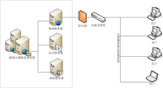客戶可以通過(guò)訪問(wèn)放置在甘肅省移動(dòng)公司面機(jī)房?jī)?nèi)的Web服務(wù)器,同時(shí)WEB服務(wù)器發(fā)送請(qǐng)求到認(rèn)證服務(wù)器,通過(guò)客戶AAA級(jí)認(rèn)證后的,客戶經(jīng)過(guò)調(diào)度服務(wù)器將請(qǐng)求反饋給視頻服務(wù)器,完成視頻點(diǎn)播流程,具體架構(gòu)如圖。