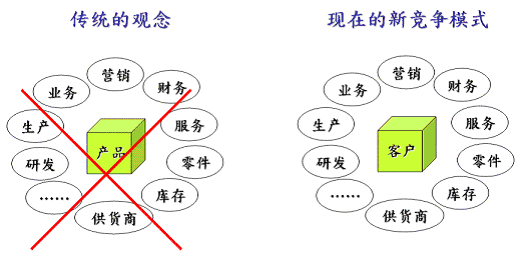在CRM系統(tǒng)架構(gòu)中,如何持續(xù)和客戶保持好關(guān)系、進而提高客滿意度是最主要目標之一,也是客戶關(guān)系管理架構(gòu)的核心價值所在。現(xiàn)在企業(yè)的競爭模式已經(jīng)從以往以產(chǎn)品為中心的思考模式,轉(zhuǎn)變到以客戶為中心的思考模式。(如圖一)