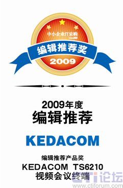CTI論壇(ctiforum)05月20日消息: 近日,由《中小企業(yè)IT采購》舉辦的2009年度編輯推薦獎評測活動落下帷幕,科達(dá)TS6210視頻會議終端以其卓越的視音頻質(zhì)量、優(yōu)異的網(wǎng)絡(luò)適應(yīng)性、極高的性價比在本次評選活動中脫穎而出,獲此殊榮。