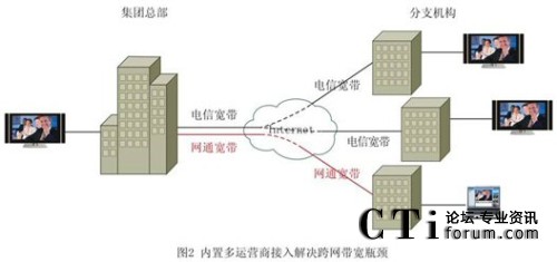 在勁霸,20個分公司、3000個形象店遍布在大江南北,因此不可避免的遇到南電信、北網(wǎng)通兩種帶寬接入情況。眾所周知,跨運(yùn)營商之間存在網(wǎng)絡(luò)瓶頸,有時連數(shù)據(jù)傳輸業(yè)務(wù)都無法正常保障。針對這一現(xiàn)狀, TrueSens視頻會議創(chuàng)新的實(shí)現(xiàn)了跨運(yùn)營商解決方案,通過支持多運(yùn)營跨網(wǎng)段接入,解決了這個在國內(nèi)普遍存在的網(wǎng)絡(luò)瓶頸。如圖2。
