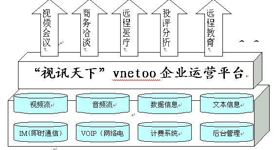 VNETOO視訊運營平臺具有強大的數(shù)據(jù)功能和優(yōu)質的音視頻效果,是集"視頻+語音+數(shù)據(jù)+IM(即時通信)+VOIP(網(wǎng)絡電話)+計費+后臺管理"的基于IP網(wǎng)絡世界一流視訊服務提供平臺,它革命性地開創(chuàng)了視訊運營領域的全新模式。(見圖表一:"視訊天下"vnetoo運營平臺結構)。