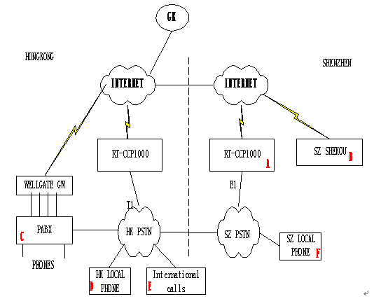 項(xiàng)目首先在香港、深圳實(shí)施,利用融天IP PBX(RT-CCP1000)把公司處于深港兩地的辦公室電話和傳真聯(lián)成一個集團(tuán)內(nèi)網(wǎng)。對外方面,在香港用一條T1接入本地PSTN,申請的號碼資源有200個,在深圳用一條E1接入本地PSTN,申請的號碼資源有100個,并且在香港申請的200個號碼資源實(shí)際供深圳使用,也就是國際來電或者香港本地?fù)艽蛟?00個號碼中綁定到深圳100個電話中某一個號碼,那么深圳該號碼對應(yīng)的話機(jī)就振鈴。這樣組成的通信網(wǎng)既可以公司內(nèi)部4位短號互撥(香港辦公室不能4位短號撥出),也可以和公司外部電話長號互撥。還有傳真服務(wù)器,提供收傳真和傳真轉(zhuǎn)Email,可以把國內(nèi)或者國際發(fā)來的傳真轉(zhuǎn)成Email轉(zhuǎn)到傳真接受者的Email上。