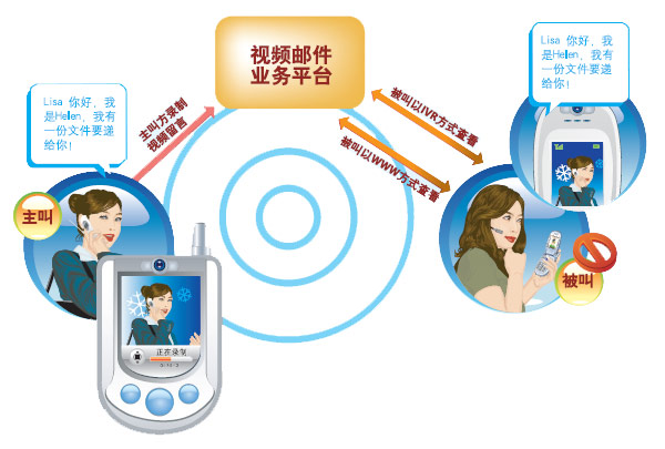 視頻郵件業(yè)務是在原有的語音郵件的基礎上又增加了極具個性化的視頻功能。即當被呼叫方忙、在3G信號覆蓋區(qū)以外或是無法接聽時可以使用視頻郵件的功能。當一個通話呼叫被切換到視頻郵件服務后,呼叫方首先將會看到一段視頻的歡迎信息,這可以是通過視頻片的方式預先錄制的個性化的視頻信息,也可以是預先設定的一個卡通形象。呼叫方可以錄下個人的視頻通話通過郵件方式傳遞給被叫。