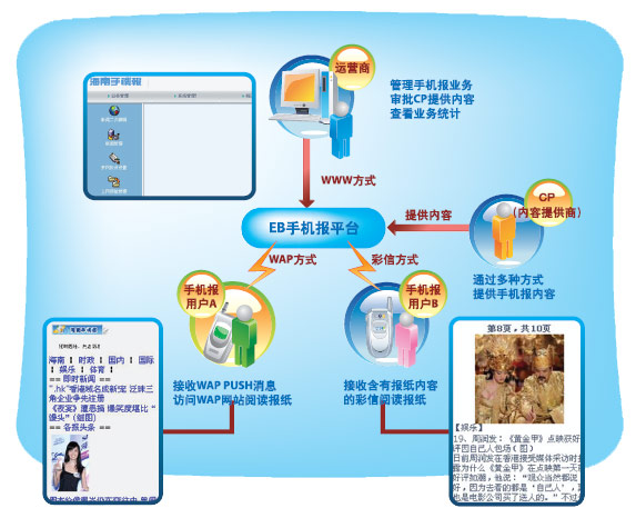 手機(jī)報(bào)是最新電信增值業(yè)務(wù)與傳統(tǒng)媒體完美結(jié)合的信息技術(shù)產(chǎn)物。實(shí)現(xiàn)將紙媒體的新聞內(nèi)容,通過無線技術(shù)平臺(tái)發(fā)送到用戶支持GPRS和彩信的手機(jī)上,使用戶在每天的第一時(shí)間通過手機(jī)閱讀到當(dāng)天報(bào)紙的全部內(nèi)容,徹底擺脫了傳統(tǒng)紙媒介的時(shí)空限制,讓讀者隨時(shí)隨地挑選和閱讀最喜歡的報(bào)紙內(nèi)容。
