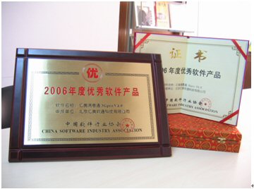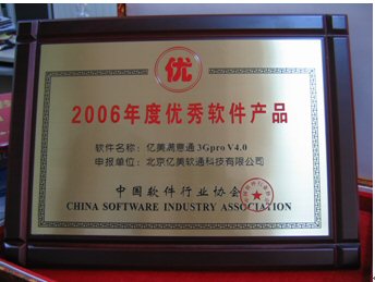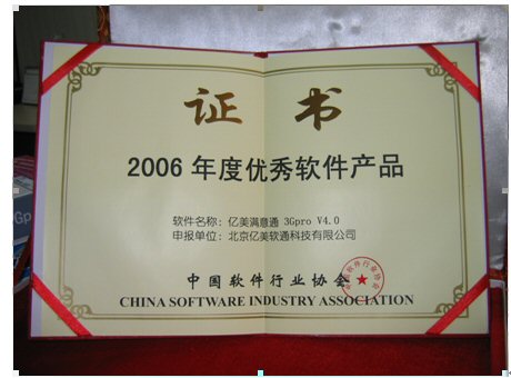 2006年1月18日,由中國(guó)軟件行業(yè)協(xié)會(huì)頒發(fā)的“2006年度推薦優(yōu)秀軟件產(chǎn)品”獎(jiǎng),經(jīng)過層層評(píng)審,終于浮出水面。北京億美軟通科技有限公司推薦的面向3G應(yīng)用的移動(dòng)商務(wù)產(chǎn)品——億美滿意通3Gpro憑借著不俗的表現(xiàn)喜獲殊榮。