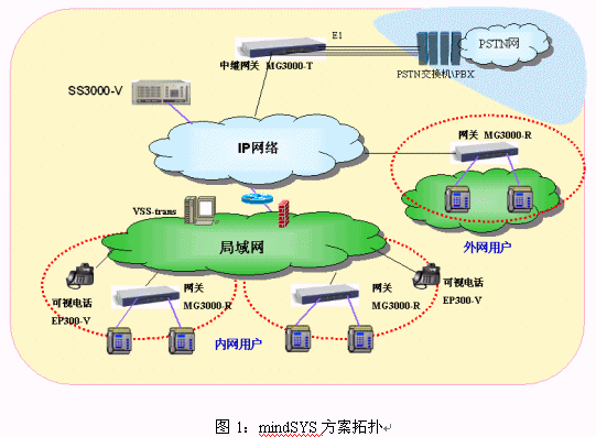 利用mindSYS平臺搭建企業(yè)內(nèi)部VoIP網(wǎng)絡(luò),需要在企業(yè)內(nèi)部部署核心信令交換設(shè)備SS3000-V,各地市部署與運(yùn)營商互通的中繼媒體網(wǎng)關(guān)MG3000-T;駐地側(cè)部署分布的語音終端接入設(shè)備,比如AG、RG、IP電話、視頻終端、軟電話等。網(wǎng)絡(luò)拓?fù)淙鐖D1所示。