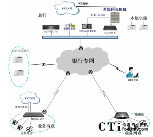 本設(shè)計(jì)方案在內(nèi)蒙中行總部的專網(wǎng)配置統(tǒng)一的控制管理平臺(tái)用于對下面各網(wǎng)點(diǎn)終端的統(tǒng)一控制管理,另外配置多E1 IP數(shù)字中繼網(wǎng)關(guān)和中行內(nèi)部的電話銀行交換機(jī)對接,實(shí)現(xiàn)IP話路和中行的電話銀行系統(tǒng)的互聯(lián)。下面各網(wǎng)點(diǎn)、理財(cái)中心部署IP專線電話終端,用于銀行客戶在各營業(yè)網(wǎng)點(diǎn)拿起話筒就自動(dòng)自動(dòng)撥號,通過銀行專網(wǎng)進(jìn)入電話銀行系統(tǒng)進(jìn)行語音互動(dòng)。