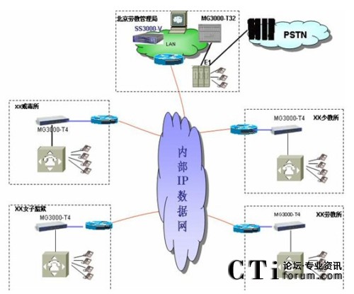 下面14個(gè)監(jiān)獄都有PBX程控交換系統(tǒng),各PBX程控交換機(jī)都可提供E1中繼板卡,采用大唐高鴻的MG3000-T4數(shù)字中繼網(wǎng)關(guān)和其對(duì)接,很方便就實(shí)現(xiàn)下面各監(jiān)獄的原來電話網(wǎng)的IP化融合改造,且對(duì)各監(jiān)獄原有的PBX程控交換機(jī)使用習(xí)慣上都不做任何改變。