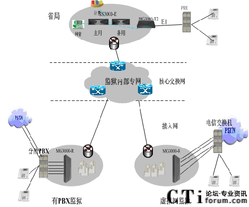 在有PBX監(jiān)獄部署智能路由網關MG3000-R32(或者數字中繼網關MG3000-T4),網關通過10/100Base-T以太網接口連接IP網絡,注冊到軟交換平臺通過路由匯接,成功的把全省各監(jiān)獄的內部電話互連互通起來。