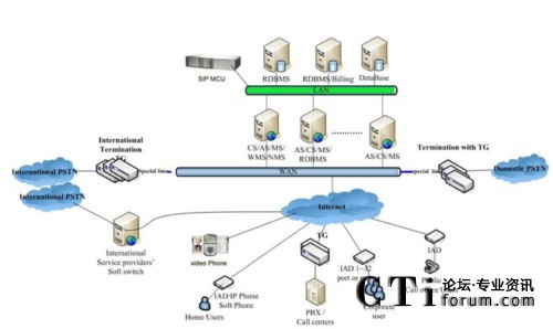 計(jì)費(fèi)系統(tǒng)將把視頻通話和普通的語音通話分開來計(jì)費(fèi),視頻會議業(yè)務(wù)也可以作為一項(xiàng)特殊業(yè)務(wù)單獨(dú)計(jì)費(fèi)。所有這些業(yè)務(wù)都使用相同的計(jì)費(fèi)和OAM系統(tǒng)。在這個運(yùn)營商級軟交換系統(tǒng)中,已經(jīng)把視頻業(yè)務(wù)完全集成進(jìn)了系統(tǒng)。下面是網(wǎng)絡(luò)示意圖: