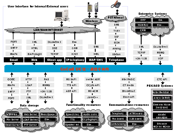 UC統(tǒng)一通信平臺是通信開發(fā)平臺的世界領先者, 提供功能強大而又迅速的開發(fā)技術來建立復雜的企業(yè)通信服務。這些技術包括CTI,傳真,數(shù)據通信,電子郵件,VXML, HTML,ASR,TTS, WAP,數(shù)據庫接入等。標準接口讓我們方便的與企業(yè)CRM、ERP、OA等系統(tǒng)連接。