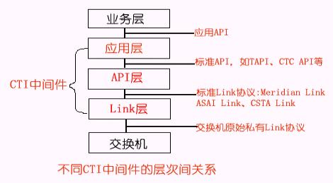 根據(jù)CTI的功能定位,我們可以把CTI產(chǎn)品劃分為不同的層次,一般地可分為三種類(lèi)型:Link層產(chǎn)品、API層產(chǎn)品、應(yīng)用層產(chǎn)品,其分層結(jié)構(gòu)示意圖如下所示: