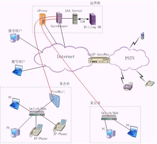 運(yùn)營(yíng)級(jí)IP電話解決方案為運(yùn)營(yíng)商提供一種可靠經(jīng)濟(jì)的VoIP接入平臺(tái)與VoIP骨干網(wǎng)互連,這種方式可以充分利用網(wǎng)絡(luò)資源,降低用戶服務(wù)價(jià)格,提高運(yùn)營(yíng)商的競(jìng)爭(zhēng)力。它為用戶提供了多種業(yè)務(wù)類型,除了可以實(shí)現(xiàn)任意兩點(diǎn)間的PC互通外,還可以實(shí)現(xiàn)PC通過(guò)VoIP網(wǎng)關(guān)與PSTN用戶間的互聯(lián)互通。