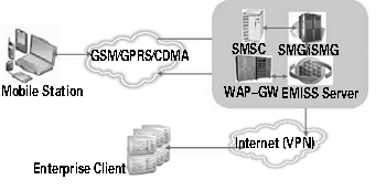 EMISS 移動(dòng)信息服務(wù)系統(tǒng)是構(gòu)建于企業(yè)平臺(tái)與移動(dòng)運(yùn)營(yíng)商數(shù)據(jù)支撐平臺(tái)之間的增值業(yè)務(wù)服務(wù)系統(tǒng),在主體結(jié)構(gòu)上劃分為EMISS Server 和Enterprise Client。
