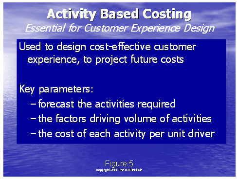 圖7說明了管理組眼中的傳統(tǒng)的成本可以怎樣分配到各行動和成本對象上去,以至于最后收入的真實成本可以在不同的客戶群上得以體現(xiàn)。下面的圖表顯示了以地理劃分的客戶群,但是很可能分配成本對象到其它的客戶群方案里,如人口統(tǒng)計學(xué)群體,銷售渠道(零售,互聯(lián)網(wǎng),代理)或其它的設(shè)計客戶經(jīng)驗的有用的種類中。