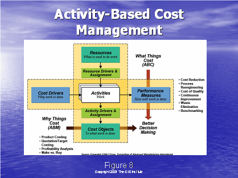 通過了解圖8,我們將以行動成本管理大體是什么的總括作為結(jié)束。我們從左邊的成本驅(qū)動因素開始——這是做工作的原因,例如:獲得客戶,維持客戶。就如圖4中所說的,這些成本驅(qū)動因素可以細(xì)分到工作行動上去?梢酝ㄟ^描述人,培訓(xùn),設(shè)備和技術(shù)資源來組成工作行動。資源驅(qū)動因素被用于分配這些企業(yè)成本到各個行動上去。下一步就是系統(tǒng)地確定行動驅(qū)動因素,分配行動成本到成本對象上去,這有利于決策的制定。例如,獲得一個客戶和維持一個客戶需要花費多少的成本?
