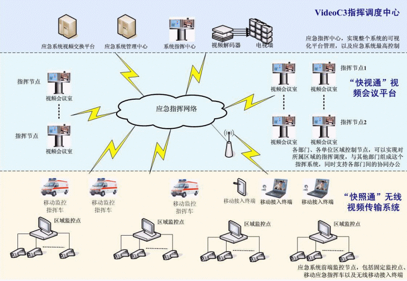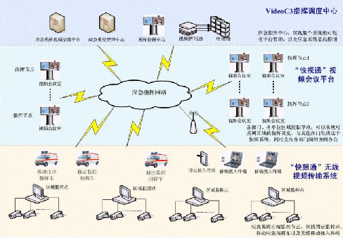C3I視頻應(yīng)急指揮協(xié)同系統(tǒng)在政府IP網(wǎng)絡(luò)中處于城市的神經(jīng)中樞。它將政府各個(gè)部門、單位聯(lián)系成為一個(gè)整體。在C3I視頻應(yīng)急指揮協(xié)同系統(tǒng)的前端,由"快照通"無線視頻傳輸系統(tǒng)對政府所屬各個(gè)單位進(jìn)行實(shí)時(shí)監(jiān)控,時(shí)刻掌握現(xiàn)場動態(tài),該部分支持固定點(diǎn)監(jiān)控,也支持移動指揮點(diǎn)和無線移動接入終端,保證了前方工作的靈活、機(jī)動性;在系統(tǒng)的指揮中心部分,由VideoC3指揮調(diào)度中心來支持,它一方面需要對前端的監(jiān)控信息進(jìn)行控制,同時(shí),要對整個(gè)政府進(jìn)行綜合管理調(diào)度,在發(fā)生突發(fā)狀態(tài)的時(shí)刻,現(xiàn)場前端"快照通"捕獲的相應(yīng)信息通過C3I系統(tǒng)平臺,迅速傳遞至指揮中心部分,政府管理人員通過VideoC3指揮調(diào)度中心對前端進(jìn)行遠(yuǎn)程指揮,在第一時(shí)間緊急處理現(xiàn)場突發(fā)事件;在整個(gè)C3I系統(tǒng)中,政府各個(gè)部門、單位之間通過"快視通"視頻會議平臺進(jìn)行辦公交流,支持各部門間的協(xié)同辦公,同時(shí),也可以通過其實(shí)現(xiàn)對所屬區(qū)域的指揮調(diào)度。