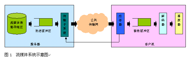 實(shí)時(shí)自適應(yīng)網(wǎng)絡(luò)帶寬的流媒體傳送技術(shù),是上海清鶴數(shù)碼科技公司的一項(xiàng)可大幅提高流媒體寬帶傳送過程中的關(guān)鍵服務(wù)質(zhì)量瓶頸的國際技術(shù)專利。我們知道,目前制約流媒體寬帶應(yīng)用發(fā)展的核心問題在于服務(wù)質(zhì)量。簡(jiǎn)單地說,由于因特網(wǎng)的狀況是不可靠的,其帶寬、負(fù)荷等變化劇烈,這難以滿足流媒體寬帶業(yè)務(wù)的實(shí)時(shí)性服務(wù)質(zhì)量要求,并常常造成播放卡殼、延遲、視頻質(zhì)量抖動(dòng)劇烈等不良情況,給使用者感官造成很大影響。所以解決好流媒體寬帶應(yīng)用的服務(wù)質(zhì)量問題對(duì)于流媒體寬帶應(yīng)用是極為重要的。如圖1所示,在一般的流媒體寬帶系統(tǒng)里,視頻服務(wù)器通過網(wǎng)絡(luò)向客戶機(jī)實(shí)時(shí)傳送流媒體信息。