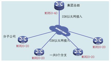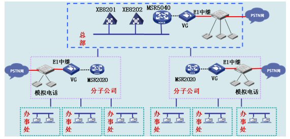 集團(tuán)總部和分子公司部署H3C公司的VG80-20作為語音網(wǎng)關(guān),VG 80-20提供2個E1語音接口用于接連接程控電話交換機(jī)PBX的E1中繼線,通過以太網(wǎng)口連接到IP網(wǎng)中。