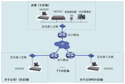 集團(tuán)總部主會場和各個分會場各部署一臺H3C公司的MG6050多媒體網(wǎng)關(guān),同時支持H.323和SIP協(xié)議,支持H.263/H.264編碼技術(shù)和4CIF高清晰圖像分辨率,最高可以提供2M會議帶寬。集團(tuán)總部主會場和各個分會場推薦使用Sony
