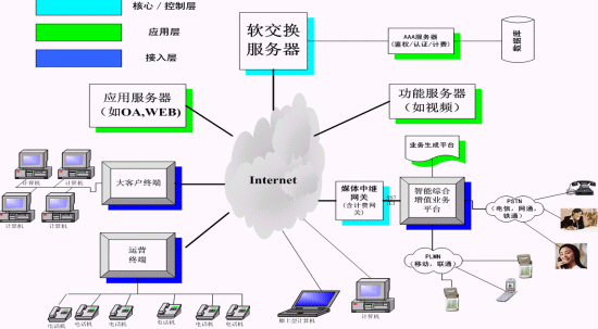 所以全能通系統(tǒng)是一種分層結(jié)構(gòu),分為接入層、核心/控制層、業(yè)務(wù)層。如下圖: