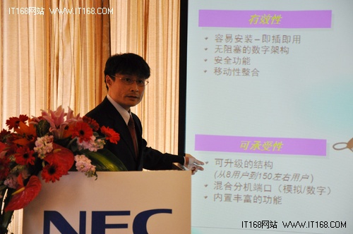 橋沢太一郎先生在發(fā)布會上表示,全新的SL1000注入了諸多先進技術和NEC十幾年在亞洲市場上的經驗。它不是一個簡單的電話產品,而是一款卓越的通信服務器。NEC為它提供IP和遠距離監(jiān)控功能,配合NEC的UC(統(tǒng)一通信)應用程序能實現(xiàn)更加有效的工作方式。