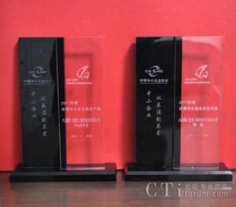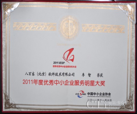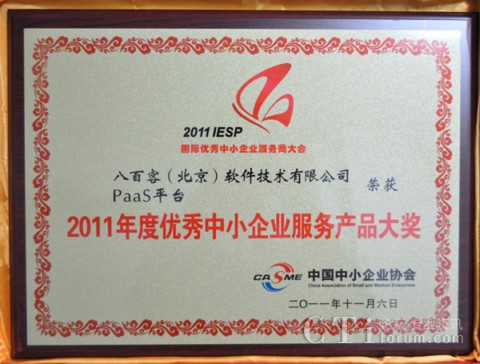 作為國內首家SaaS廠商,八百客積極推動云計算在中小企業(yè)中的宣傳與運用。2006年,八百客在國內率先推出管理自動化開發(fā)平臺800APP, 它擴展了按需服務,并實現了客戶可根據需要自定制應用程序,成為了改變應用程序開發(fā)的一個新途徑。為表彰八百客在中小企業(yè)信息化中做出的杰出貢獻,本次大會特別為八百客頒發(fā)了“2011年度優(yōu)秀中小企業(yè)服務產品大獎”,此外還授予八百客總經理李智 “2011年度優(yōu)秀中小企業(yè)服務明星大獎”。