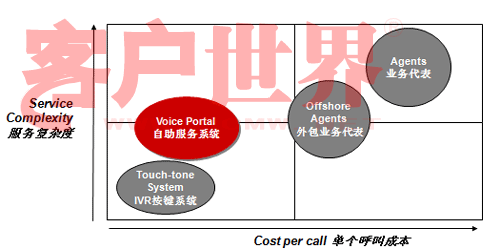 讓我們來看看這張圖。這張圖縱軸是服務(wù)的復(fù)雜度,橫軸是單位呼叫成本,傳統(tǒng)的IVR(觸鍵的語音IVR)和人工服務(wù)相比,服務(wù)的復(fù)雜度可就差多了。而Voice Portal的概念是用比較少的成本做更多的業(yè)務(wù),從成本上講比原來的傳統(tǒng)的IVR可能成本稍微高一點(diǎn)點(diǎn),但是和人工服務(wù)相比,無論是和單位自建呼叫中心座席比,還是和外包呼叫中心座席比,成本都有很大降低,但業(yè)務(wù)復(fù)雜度可以做得比傳統(tǒng)IVR復(fù)雜很多。我們承認(rèn),就提供服務(wù)的內(nèi)容來講,Voice Portal今天仍然不能夠像人工那樣提供那么全面的服務(wù),但是可以涵蓋很多服務(wù)內(nèi)容,在這方面一是因?yàn)榧夹g(shù)先進(jìn)了,另一方面也在于引導(dǎo)。今天我看到越來越多的客戶已經(jīng)開始有意識(shí)的推行自助服務(wù)形式。我前幾年去新加坡打出租,發(fā)現(xiàn)在新加坡有很多叫出租的車站,車站上有一個(gè)按鍵,按鍵上有一個(gè)編碼,說明你在什么位置,當(dāng)你打通出租車客服的電話,你只要告訴這個(gè)編碼,他們就自然而然知道你在什么地方,并把要來接你的車車牌號(hào)通過語音報(bào)讀方式通知你。今天在中國也開始有這種形式了。昨天我沒有開車,也算是支持北京市每周少開一天車的號(hào)召,我打了出租,在和出租司機(jī)聊天的過程中,出租司機(jī)說現(xiàn)在油價(jià)很貴,他們有很強(qiáng)烈的需求不愿意掃馬路,他們也有一個(gè)出租車叫車電話,那個(gè)呼叫中心大概有上百個(gè)坐席,這個(gè)公司有一萬六千輛出租車在北京,由他們來進(jìn)行搶答,搶答完之后你可以告訴說這個(gè)人在什么地方等,唯一不同的我們?cè)谧灾线沒有做得那么到位,司機(jī)搶到了活還要給客戶打一個(gè)電話,不象新加坡完全是自助的,你只要按了那個(gè)鍵,系統(tǒng)就知道你在什么地方,當(dāng)尋找到合適的車的時(shí)候,語音報(bào)讀你車牌號(hào)就行了。我和說出租車師傅,那你打電話成本不是增加了嗎,他一笑,增加打一個(gè)電話的成本怎么也比掃馬路強(qiáng)。大家可以看看呼叫中心多有用,自助服務(wù)能省多少錢。