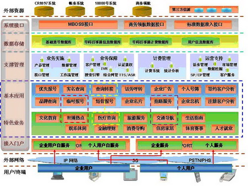 功能上分為企業(yè)門戶與個(gè)人門戶。企業(yè)門戶可以通過(guò)話務(wù)員服務(wù)以及企業(yè)網(wǎng)上自服務(wù)提供號(hào)碼百事通的業(yè)務(wù)受理等功能;個(gè)人門戶同樣可以通過(guò)話務(wù)員及個(gè)人網(wǎng)上自服務(wù)功能提供號(hào)碼百事通所有的業(yè)務(wù)。