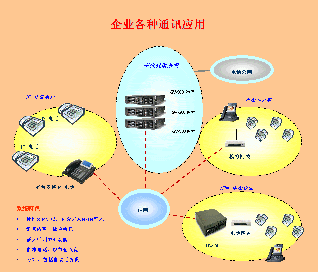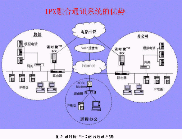 將訊時捷?IPX放在公司總部,其它分支機構(gòu)可以通過IP話機,軟電話或者網(wǎng)關(guān)設(shè)備登錄到總部的IPX上,這樣就形成了整個公司的VOIP網(wǎng),建立了企業(yè)自己的通訊平臺。