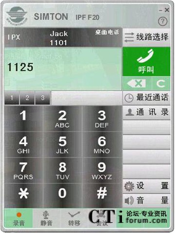企業(yè)版需要另行購(gòu)買,突出的功能包括“電子通信錄”、“軟電話與臺(tái)式電話機(jī)綁定”等!半娮油ㄓ嶄洝惫δ芤杨A(yù)裝在軟電話中,就像手機(jī)的通訊薄一樣。企業(yè)的員工不需要自己逐條輸入通訊錄,錄入與更新由企業(yè)的系統(tǒng)管理員在企業(yè)的通訊服務(wù)器上進(jìn)行,一人操作,全公司通訊錄同步更新。一個(gè)集團(tuán)公司或政府機(jī)構(gòu)有成百上千個(gè)員工很正常,但要讓大家記住這幾百個(gè)電話號(hào)碼就很困難了,目前較為常見的解決辦法有以下幾種,小一點(diǎn)的企業(yè)或機(jī)構(gòu)通常會(huì)打印一張通訊錄發(fā)放給每個(gè)員工,員工撥號(hào)前會(huì)先查一下這張通訊錄然后再將電話號(hào)碼在臺(tái)式辦公電話機(jī)上逐個(gè)輸入;規(guī)模大一點(diǎn)的企業(yè)會(huì)專門印制一本通訊薄發(fā)給每個(gè)員工,但由于機(jī)構(gòu)龐大,往往等到通訊簿發(fā)到手上,其中有很多電話號(hào)碼已經(jīng)不正確了。F20型軟電話的“與臺(tái)式電話機(jī)綁定”功能就很好的解決了這個(gè)問(wèn)題,通過(guò)將電腦上的軟電話與辦公桌上的臺(tái)式電話機(jī)進(jìn)行綁定,企業(yè)中的所有員工在打電話時(shí),都可以先點(diǎn)擊電腦軟電話中的通訊錄,快速找到需要的電話號(hào)碼,然后只需點(diǎn)擊這個(gè)號(hào)碼條,這個(gè)員工的臺(tái)式電話機(jī)就會(huì)自動(dòng)向目標(biāo)電話進(jìn)行撥號(hào),待對(duì)方摘機(jī)后,這個(gè)員工的臺(tái)式電話機(jī)就會(huì)響起鈴聲,此時(shí)摘機(jī)就可進(jìn)行通話了。確實(shí)夠方便,夠?qū)嵱茫?