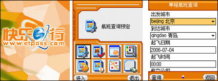 “快樂e行”預(yù)裝在手機中的存儲卡中,可直接安裝到手機的應(yīng)用菜單欄里,點擊圖標,就可以直接進入首頁。圖形化的操作按鍵、簡明的文字提示、順暢的操作流程,人性化的設(shè)計讓機票預(yù)訂變得不再麻煩。