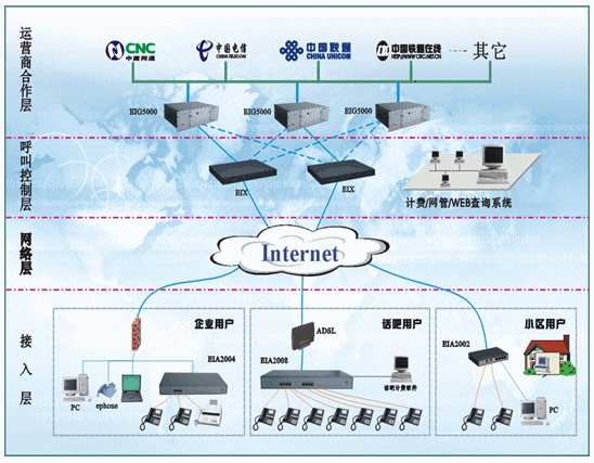 - 在運營商合作層,EIG5000系列是集軟交換為一體的數(shù)字中繼網(wǎng)關(guān),與傳統(tǒng)運營方案比減少了設(shè)備投入,更加保證可靠方便的應(yīng)用,EIG5000系列可以配合網(wǎng)管系統(tǒng)、計費系統(tǒng)、WEB管理系統(tǒng)組成整個完整的局端運營系統(tǒng),而增加EIX7100設(shè)備可以更好的冗余備份,使整個運營平臺更加穩(wěn)定。EIA設(shè)備根據(jù)客戶類型和需求配置相應(yīng)的設(shè)備;