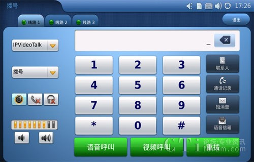 7寸大屏搭配寬大的數(shù)字虛擬鍵盤(pán),讓你的撥號(hào)準(zhǔn)確無(wú)誤。同時(shí)界面的所顯示的通話(huà)功能諸如查找聯(lián)系人、查找通話(huà)記錄、發(fā)送短消息或者快速進(jìn)入語(yǔ)音信箱等功能也清晰明了。可以發(fā)現(xiàn)的是,用戶(hù)在輸完號(hào)碼之后可自主選擇采用語(yǔ)音呼叫還是視頻呼叫。另外,同Grandstream之前的一款視頻電話(huà)GXV3140一樣的是,GXV3175也在出廠(chǎng)自帶了一個(gè)IPVideoTalk賬號(hào)。該賬號(hào)是出廠(chǎng)時(shí)就已配置好的,每一臺(tái)電話(huà)配備一個(gè)號(hào)碼并顯示在桌面上。也就是說(shuō),用戶(hù)在拿到GXV3175并聯(lián)網(wǎng)之后即可使用該賬號(hào)撥打免費(fèi)的視頻電話(huà)了。這可是很多廠(chǎng)商所沒(méi)有的特殊功能。下面我們就使用隨機(jī)附送的IPVideoTalk賬號(hào)來(lái)?yè)艽蛞曨l電話(huà)。