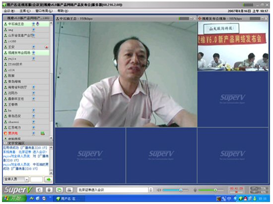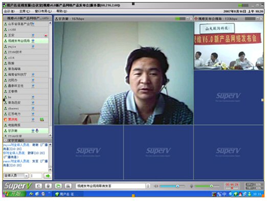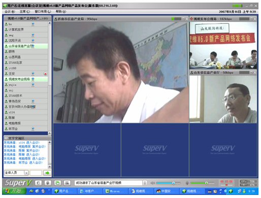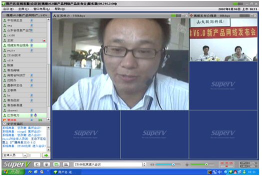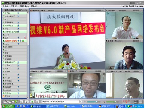 2007年8月16日,視維視頻會議V6.0新產品網(wǎng)絡發(fā)布會在美麗的泉城濟南舉行,山東省信息產業(yè)廳、濟南市信息產業(yè)局的領導、山東省電信等上級主管部門領導,視維產品新老用戶和有視頻會議需求的潛在客戶,國內外合作伙伴,IT168、中國計算機報、電腦商報、C114、支點網(wǎng)、計算機世界、CTI論壇、投影時代等國內知名媒體100多人參加了這次網(wǎng)絡發(fā)布會。在此次會議上,山大聯(lián)潤公司通過視頻會議與各地與會者進行了良好的溝通,同時這次發(fā)布會開創(chuàng)了用視頻會議發(fā)布新產品的先河。