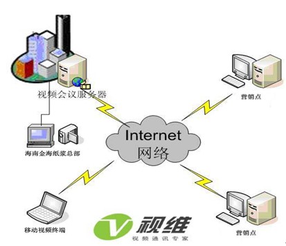視維團(tuán)隊(duì)根據(jù)海南金海紙漿的網(wǎng)絡(luò)現(xiàn)狀和IT硬件資源以及低碳環(huán)保高效溝通的需求設(shè)計(jì)了一套經(jīng)濟(jì)可行的視頻會(huì)議系統(tǒng)解決方案,以海南金海紙漿為主會(huì)場(chǎng),全國(guó)各營(yíng)銷點(diǎn)為分會(huì)場(chǎng)。拓?fù)鋱D如下: