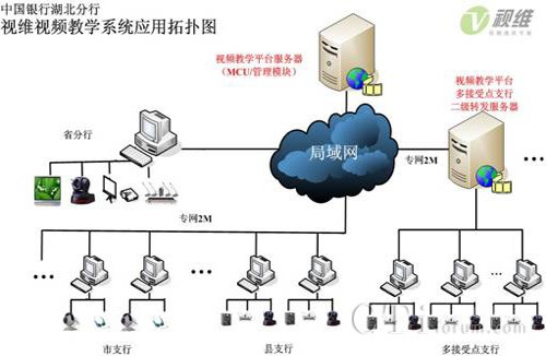 中國(guó)銀行湖北分行的視頻教學(xué)系統(tǒng)由服務(wù)器端和客戶(hù)端組成,服務(wù)器端軟件部署在省分行中心機(jī)房,配置2臺(tái)服務(wù)器,對(duì)于接受點(diǎn)超過(guò)5個(gè)的分支機(jī)構(gòu)配置二級(jí)轉(zhuǎn)發(fā)服務(wù)器,共支持全省各支行及支行內(nèi)多個(gè)客戶(hù)端同時(shí)在線,負(fù)責(zé)所有培訓(xùn)的召集、音視頻交互、加密等工作,各支行通過(guò)WEB方式即可實(shí)現(xiàn)客戶(hù)端軟件的自動(dòng)安裝與升級(jí),輕松實(shí)現(xiàn)實(shí)現(xiàn)省分行以及各支行共77余個(gè)接受點(diǎn)的高清音視頻視頻教學(xué)。同時(shí)為中國(guó)銀行湖北分行的視頻教學(xué)系統(tǒng)配置異構(gòu)兼容模塊,支持與其他視頻會(huì)議及軟、硬件視頻教學(xué)系統(tǒng)無(wú)縫融合,避免重復(fù)投資造成的浪費(fèi)。網(wǎng)絡(luò)拓?fù)鋱D如下: