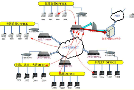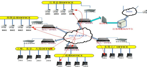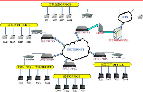 各地的IPPBX會(huì)自動(dòng)識(shí)別輸入的號(hào)碼,并且通過(guò)網(wǎng)絡(luò)把號(hào)碼送到蘇州總部的1200交換機(jī),江蘇的1200交換機(jī)已經(jīng)通過(guò)E1與江蘇網(wǎng)通的NGN服務(wù)器對(duì)接。網(wǎng)通收到你輸入的被叫號(hào)碼,即發(fā)出呼叫,完成你的一次呼叫。如果有新辦事處成立,只要有網(wǎng)絡(luò),可不用申請(qǐng)當(dāng)?shù)氐碾娫捑路也可實(shí)現(xiàn)輕松辦公。