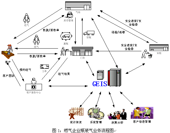 GEIS燃氣運營管理信息系統(tǒng)的應用是企業(yè)的長期發(fā)展的驅(qū)動力,它是一套以客戶服務接觸中心為龍頭、以運營生產(chǎn)流程管理為龍身、以經(jīng)營分析為龍尾的閉環(huán)信息處理系統(tǒng)。它由客戶服務中心子系統(tǒng)、門市業(yè)務子系統(tǒng)、氣站管理子系統(tǒng)、安全搶修平臺和管理與集成模塊組成。實踐的事實告訴我們,它起到保持客戶忠誠度、提升企業(yè)品牌影響力、提高業(yè)務運作效率、加快業(yè)務經(jīng)營決策和促進企業(yè)持續(xù)發(fā)展的作用。